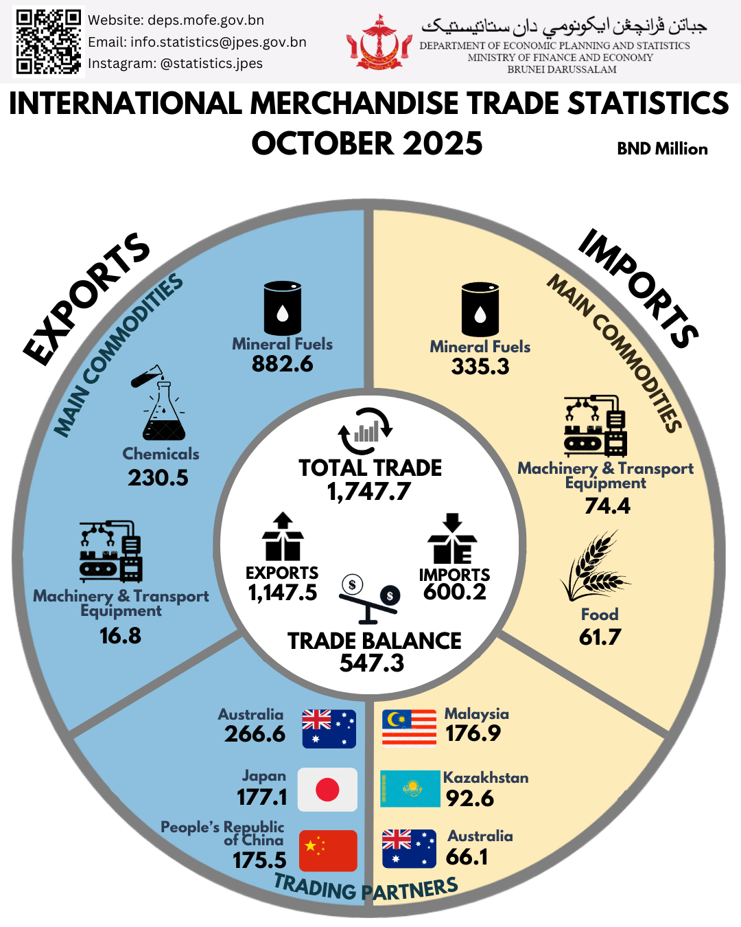 Total trade for October 2025 was BND1,747.7 million, comprising exports of BND1,147.5 million and imports of BND600.2 million. This reflected a year-on-year increase of 4.1 per cent from BND1,678.3 million in October 2024. Meanwhile, the trade balance also increased by 24.1 per cent to BND547.3 million (October 2025) from BND440.9 million in October 2024.